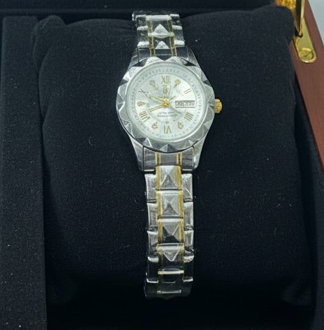 ডায়ালে রোমান সংখ্যা এবং পাথরের কাজ দেওয়া আছে, যা ঘড়িটিকে লাক্সারি লুক দেয়।